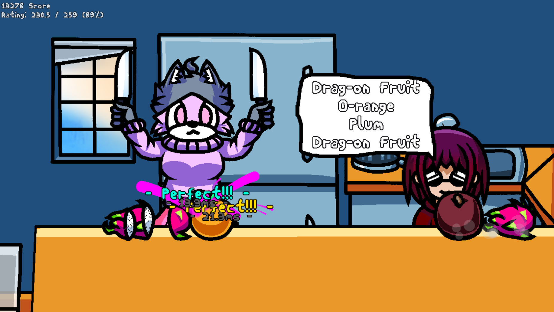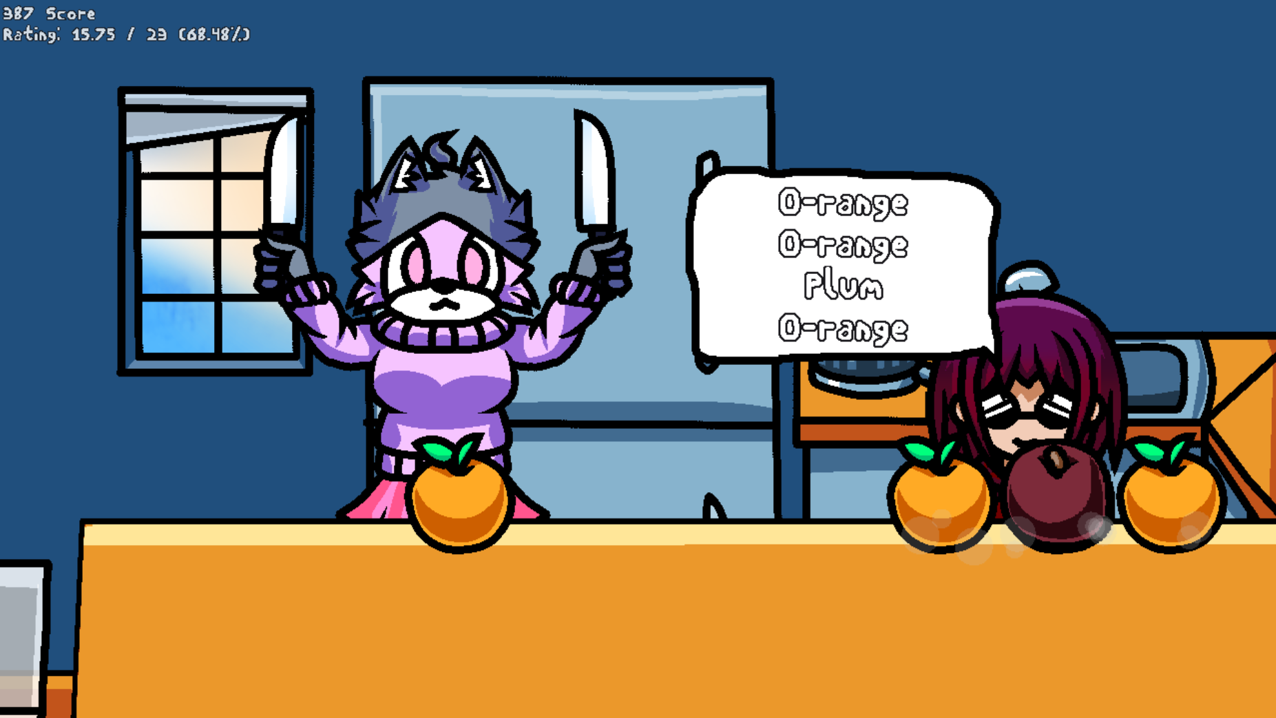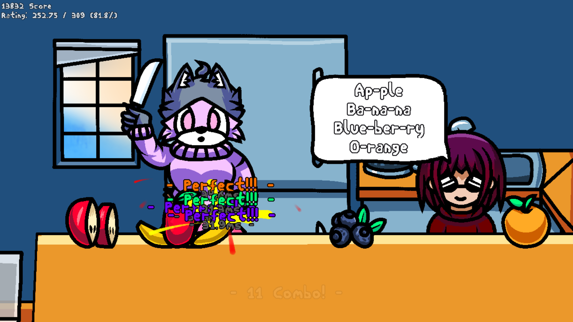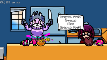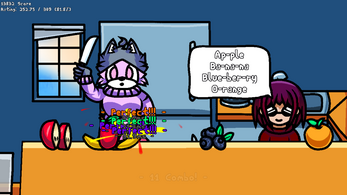 Press a button in rhythm to the music to slice incoming fruit accordingly.